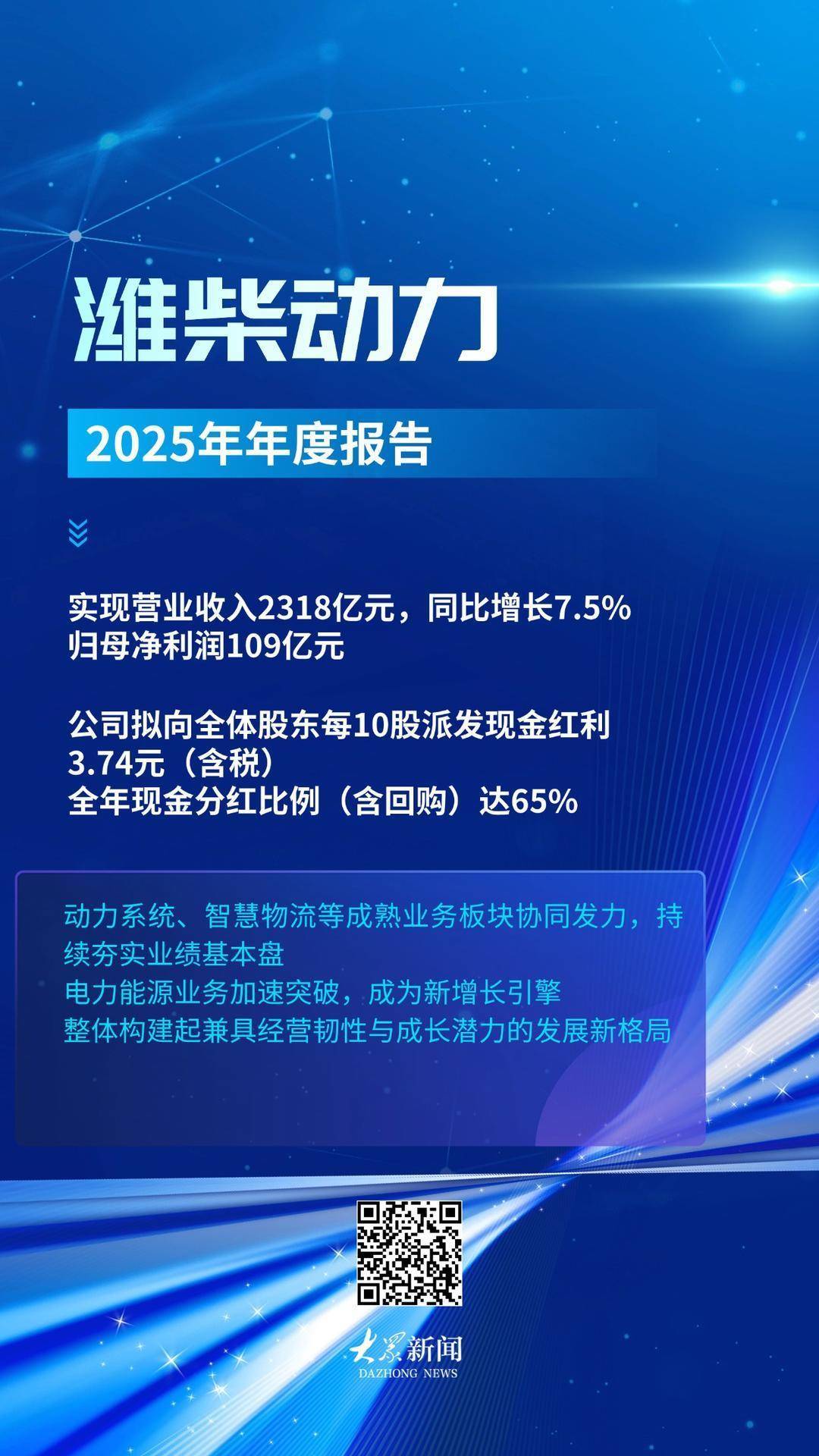 3月26日晚间,潍柴能源败露2025年年度诠释注解。诠释注解期内,杀青营业收入2318亿元,同比增长7.5%;归母净利润109亿元。基于稳健蓄意功绩,公司拟向全体股东每10股派发现款红利3.74元(含税),全年现款分成比例(含回购)达65%。