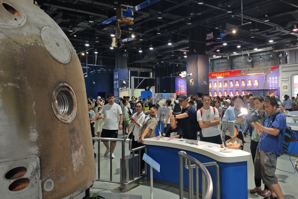 暑期的中国科技馆东说念主头攒动,“神舟一号”复返舱什物劝诱旅客围不雅。(中国科技馆供图)