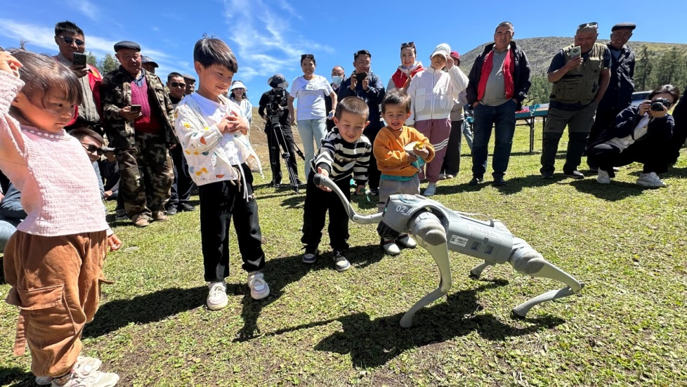 科普大篷车开进新疆阿勒泰青河县套查干湖夏牧场,当地小一又友和机器狗互动。(新疆科技馆供图)