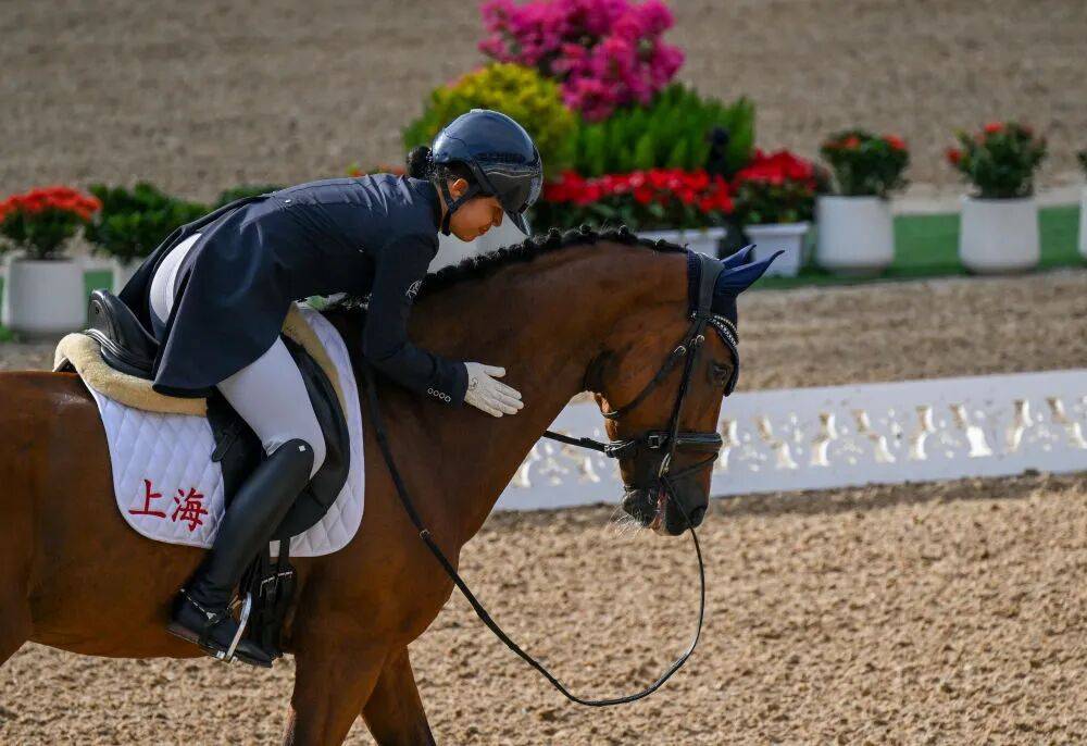 图:11月10日,上海队选手徐墨菲在比赛后轻拍她的马匹“好好”