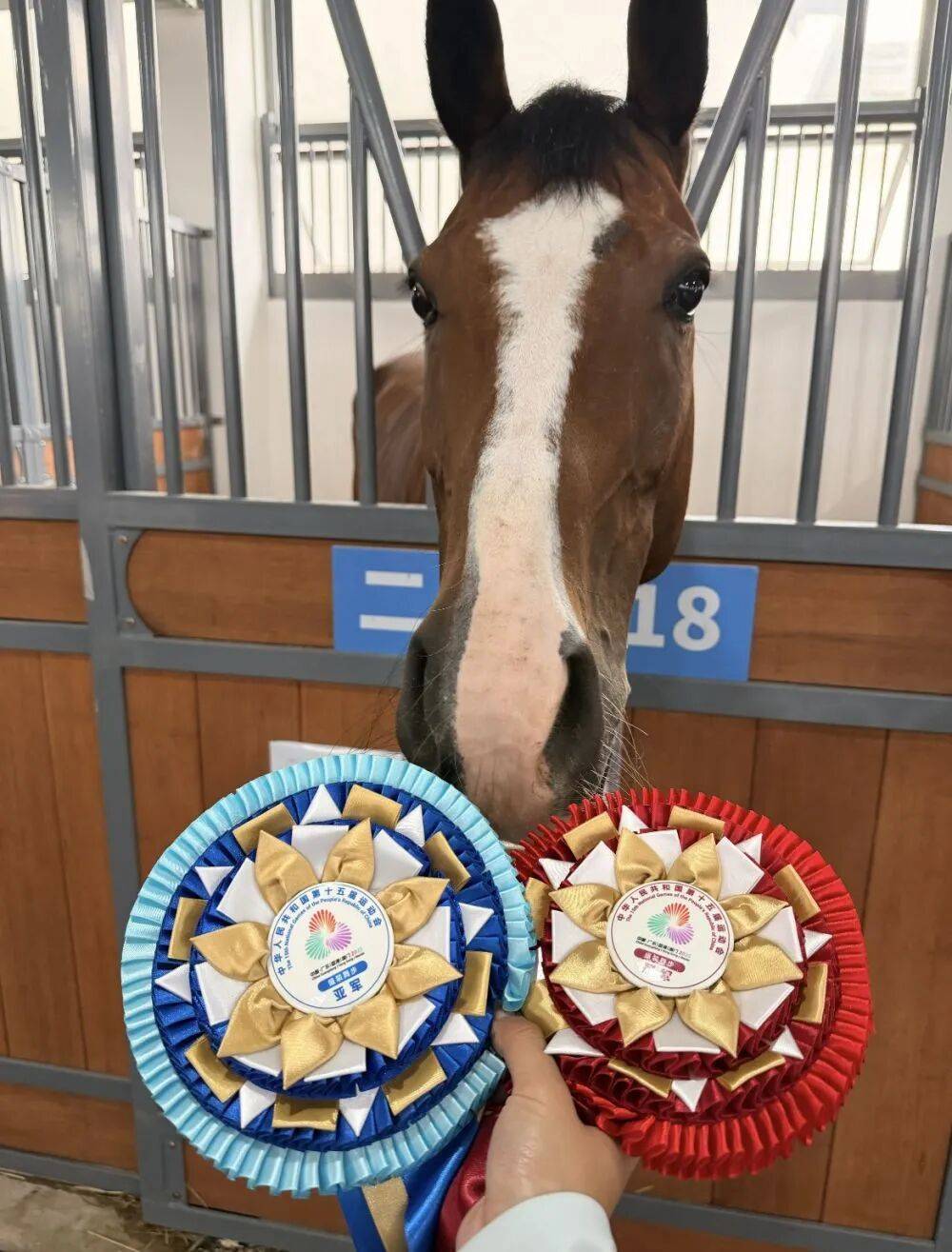 此时,不仅骑手胸前醒目着奖牌,马的左耳旁也别着一朵细密的“马花”,上头显着地标注着比赛技俩与排名——这是获奖马匹的专属“奖牌”。