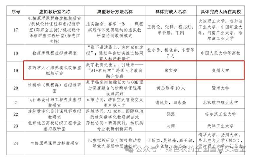 近日,由教诲部高级教诲司提示、臆造教研室边幅文书处组织评比的“2025年度臆造教研室试点竖立典型”名单精采公布。贵州大学宋宝安院士团队牵头的农药学东谈主才培养时势校正臆造教研室以“数字教诲走出去,引进来——‘AI+农药学’跨国东谈主才教诲交融试验”为题的“典型教研技艺”告捷入选,是贵州省惟一获此盛誉的高校。